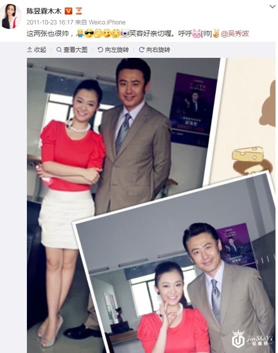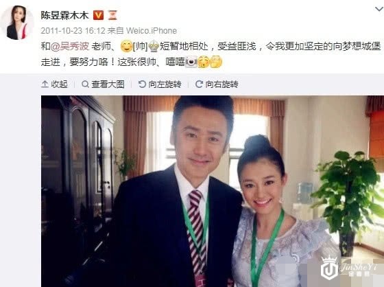 并且在她的微博之中不难发现早在2011年就已经有了她和吴秀波的合影,而且当时的她称吴秀波为老师。不难发现这与她上面所说的似乎已经高度的符合。从她下面的微博之中其实就可以发现她对吴秀波是十分的着迷,声称短暂地相处,受益匪浅,令我更加坚定的向梦想城堡走进,要努力咯!这张很帅、嘻嘻!