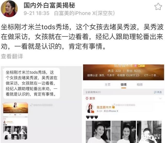 可无独有偶,早在9月21号就有网友声称在米兰的秀场上这个叫木木的女孩子就去堵过吴秀波,声称是要问他拿一个说法。当时的她还只是在一边看着吴秀波,而经纪人和助理也是出来劝她。知情人声称一看就是认识,而且是有事情发生了。而时隔3天,中秋节的这天被曝出了吴秀波出轨,难道真的有事情发生?