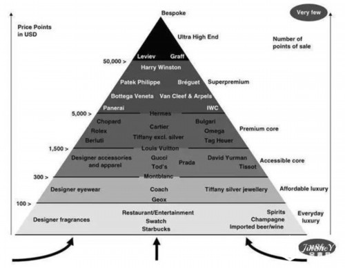不过消费行业有一个比较公认的奢侈品划分标准,是汇丰银行Erwan Rambourg在他的名为The Bling Dynasty的书中做的奢侈品分级价位来定的,2015年被刊登在Business Insider上。