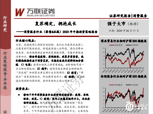 影响下半年消费服务行业投资的关键因素:疫情、宏观经济、政策。1)疫情:国内二次爆发概率不大,关注疫苗研发进展。国内疫情控制良好,疫情控制“常态化”,国外疫情仍处于爆发阶段,尚未见顶。我国防控有序,下半年疫情在我国二次爆发概率不大,主要风险来源于外部输入,乐观估计2020年底或2021年初疫苗可能研发成功并推出。2)政策:政府力推组合拳刺激消费,重点支持消费服务业复苏。从消费券投放到税收优惠,多措并举促进消费回升,两会重点强调扩大内需战略,支持餐饮、商场、旅游等生活服务业恢复发展,预计相关政策还会持续推出。3)宏观经济:可选消费加快复苏,食品CPI增速从高位逐步回落。社零总额增速降幅收窄,同时可选消费加快复苏,疫情扩大了CPI的结构分化,食品CPI创历史新高,预计下半年逐步回落,但全年平均食品CPI仍在高位。