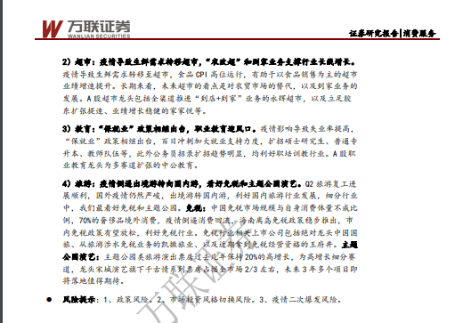 4)旅游:疫情倒逼出境游转向国内游,看好免税和主题公园演艺。Q2旅游复工进展顺利,国外疫情仍然严峻,出境游转国内游,利好国内旅游行业发展,细分行业中,我们最看好免税和主题公园。免税:中国免税市场规模与自身消费体量不成比例,70%的奢侈品境外消费,疫情倒逼消费回流,海南离岛免税政策稳步推出,市内免税政策有望放松,利好免税行业。免税行业相关上市公司包括绝对龙头中国国旅、从旅游涉水免税业务的凯撒旅业、以及近期拿到免税经营资格的王府井。主题公园演艺:主题公园类旅游演出票房过去几年保持20%的高增长,为高增长细分赛道,龙头宋城演艺旗下千古情系列票房占据全市场2/3左右,未来3年多个项目即将落地值得期待。