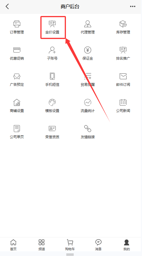 黄金大盘价格设置说明:商家会员登录会员中心,按照下面图片指引完成金价设置。