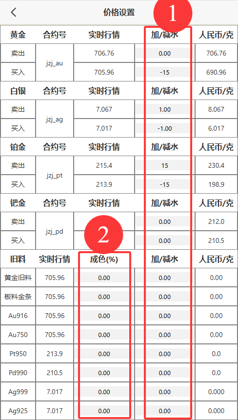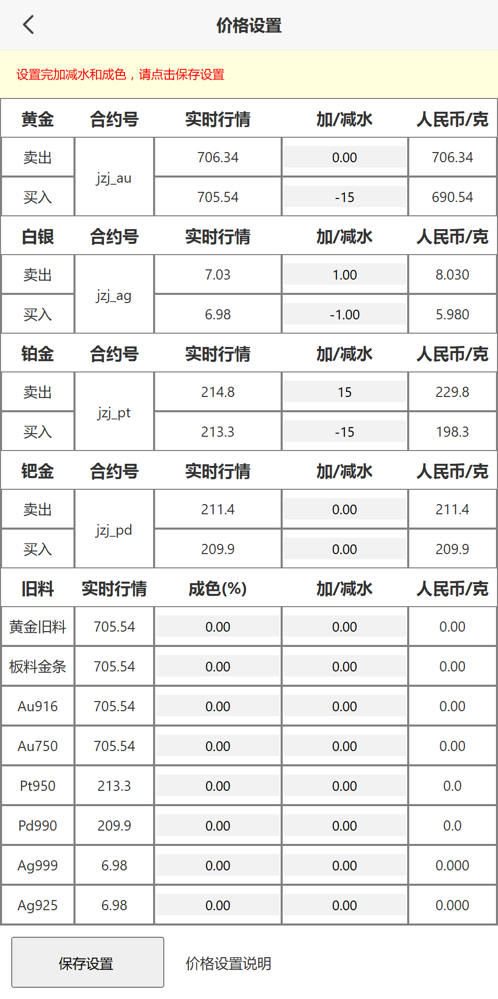 进入金价设置。可以看到完整的设置界面,右边首列是前端展示给客户的数据。(如上图所示)