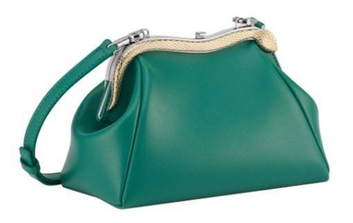 宝格丽SERPENTI ELLIPSE系列小号斜挎包定价16500元,包身采用鲜绿色都市粒纹小牛皮材质,搭配镶嵌宝石的经典蛇首磁扣,灵感源自1960年代的一枚BULGARI宝格丽腕表。包包配有链条和皮革肩带及皮革手柄,顶部拉链开合,一个内部口袋,一个背面外置口袋。