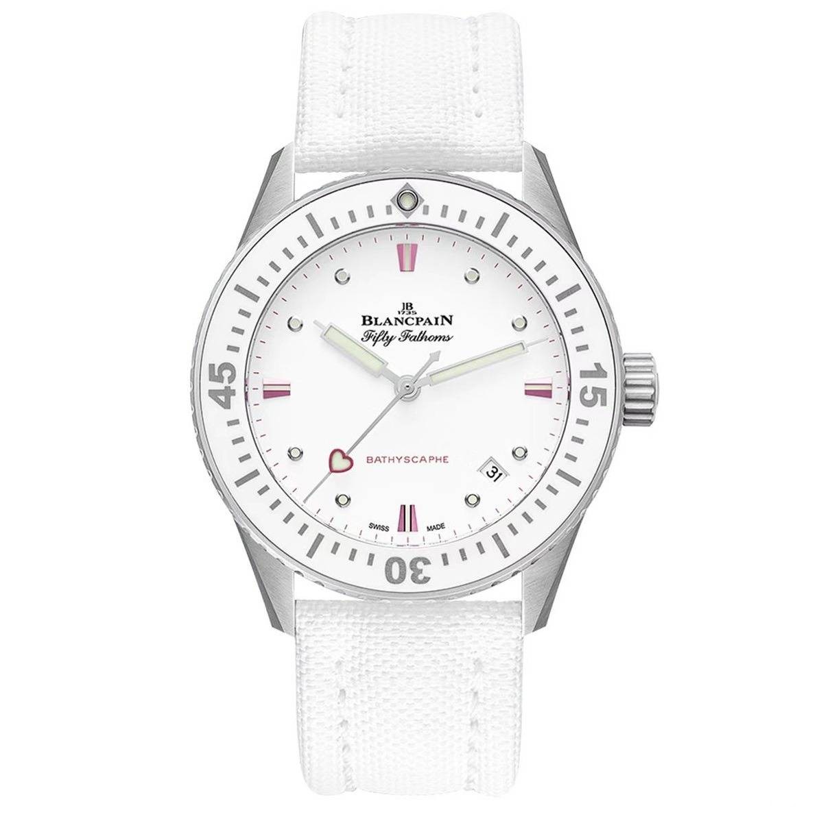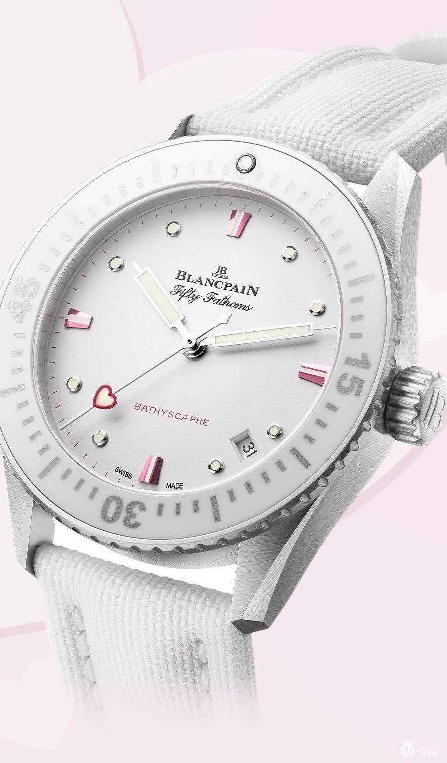 Fifty Fathoms 五十噚系列深潜器Bathyscaphe “2023年情人节”限量款腕表 5100A,柔粉色的时标刻度、夜光心形的秒针尖端以及纯粹洁白的腕表配色,宝珀将这些细腻浪漫的元素通过巧妙设计一一呈现,尽显甜蜜爱恋。
