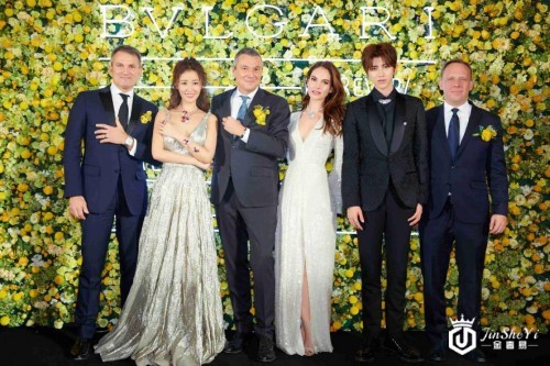 (从左至右)宝格丽全球销售执行副总裁Lelio Gavazza、林心如、宝格丽首席执行官Jean-Christophe Babin、莉莉·詹姆斯、蔡徐坤、宝格丽大中华区董事总经理Kolia Neveux