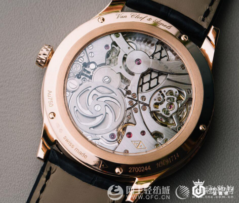 该表款搭载着的仍然是由品牌与Agenhor合作开发的机芯,那精致的菱形纹铂金双向上链摆陀很有特色,让表背处所展现的风景看着更引人入胜了不少。这枚机芯可提供48小时的动力储备,透过蓝宝石水晶表背看去,整体的修饰工艺足够令人赞叹。然而,更值得我们关注的则是,梵克雅宝是如何将两地时显示、逆跳分钟以及跳时这三个概念以十分简洁的方式结合在一起,还将之转化为了一款可读性出众且非常实用的腕表的。