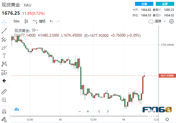 美市盘中,现货黄金短线拉升逾20美元,刷新日高至1680.23美元。
