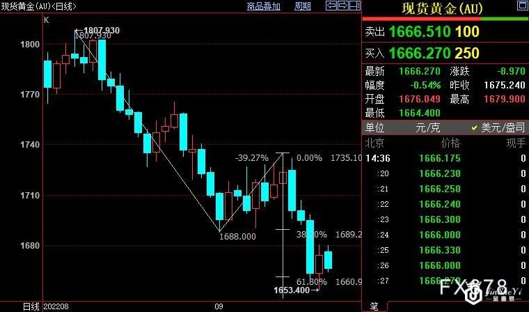 周一(9月19日),国际金价下滑,因投资者准备迎接主要央行、尤其是美联储本周大幅加息,以抑制高通胀。尽管美联储进一步扩幅加息可能性不大,金价仍下看1643美元。 北京时间15:04,现货黄金下跌0.59%至1664.76美元/盎司;COMEX期金主力合约下跌0.64%至1672.8美元/盎司;美元指数上浮0.37%至110.078。 City Index高级市场分析师Matt Simpson说:“在FOMC会议之前,我们将看到金价维持横盘震荡,1680美元可能是近期关键阻力位。若美联储激进加息,金价可能会跌至1600至1650美元区间。” 高盛下调2023年美国国内生产总值预期,原因是美联储将在今年剩余时间内采取更积极的紧缩货币政策,并认为这将推动失业率高于此前预期。 高利率增加了非孳息资产黄金的持有成本。美国商品期货交易委员会上周五(9月16日)表示,在截至9月13日的一周内,COMEX黄金投机者持有净空头头寸10132手。 但9月密歇根大学消费者信心指数初值显示,通胀预期温和下降,消费者对明年通胀预期自8月份的4.8%降至4.6%,录得12个月以来的最低值。这缓解了美联储进一步扩幅加息担忧。 美联储联邦公开市场委员会(FOMC)预计将于9月20日开始为期两天的利率会议,并于次日宣布新的决议。市场完全消化了美联储75个基点加息预期。 日线上看,金价自1735美元开启下行3浪,跌破61.8%目标位1661美元,后市料下探76.4%目标位1643美元。3浪是自1808美元开启下行III浪的子浪,III浪38.2%目标位在1658美元。III浪是自2070美元开启的下行©浪的子浪。