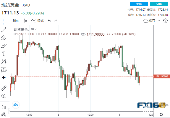 (现货黄金30分钟走势图,来源:FX168)