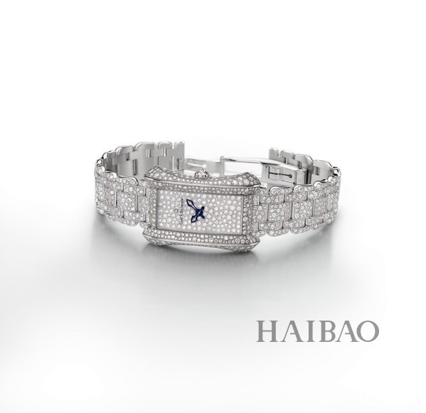 表壳:18K白金, 镶348 颗TW vvs 美钻 (3.30克拉) , 双面抗折射弧形蓝宝石水晶镜面, 防水深度 30米,尺寸26.5毫米 × 38毫米, 厚度 7.4毫米