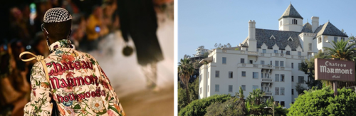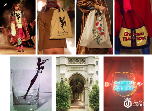 与马蒙特城堡深入人心的哥特字体标识相呼应的,还有饰于该酒店的洗衣袋、鸡尾酒搅拌棒和喷泉等处的潘神(Pan)图案,以及古驰标志性的花卉图案。别名牧神,半人半兽形态的潘神被视作马蒙特城堡的守护神,它以纵情声色闻名,自1990年起成为酒店主人的André Balazs说:“潘神的形象隐含了这家酒店的态度与意义,几乎如同logo一般重要。”而这位被广泛认为是希腊神祗中唯一死去的神,亦应和了在阿尔勒发布的Gucci 2019早春系列的重生主题。