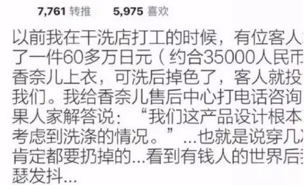 大伙儿还记得去年一件类似的事情吗?一网友买了一件35000元的香奈儿上衣洗后掉色了便打电话问客服。客服说:不好意思,我们的产品从来不考虑洗涤。
