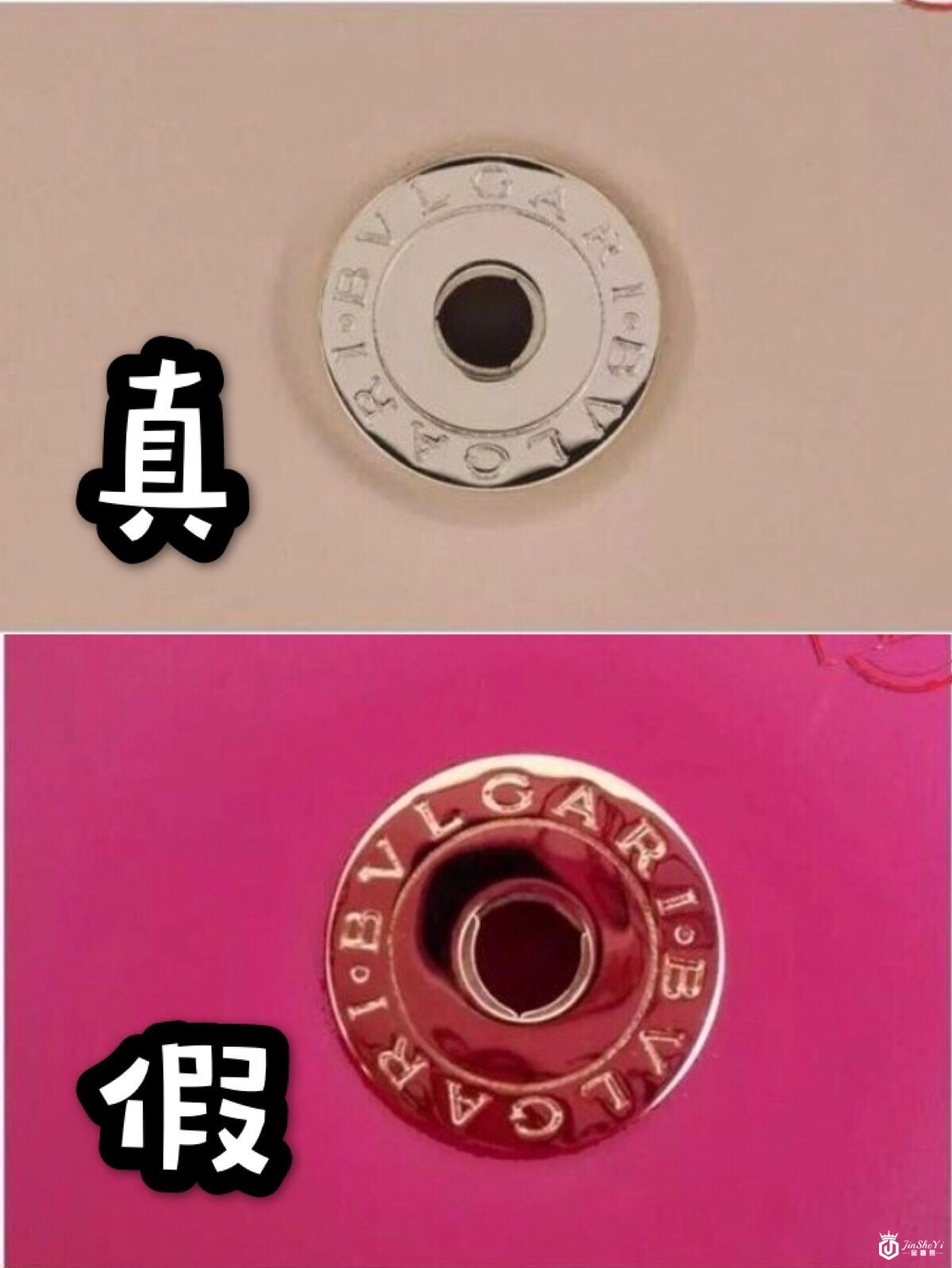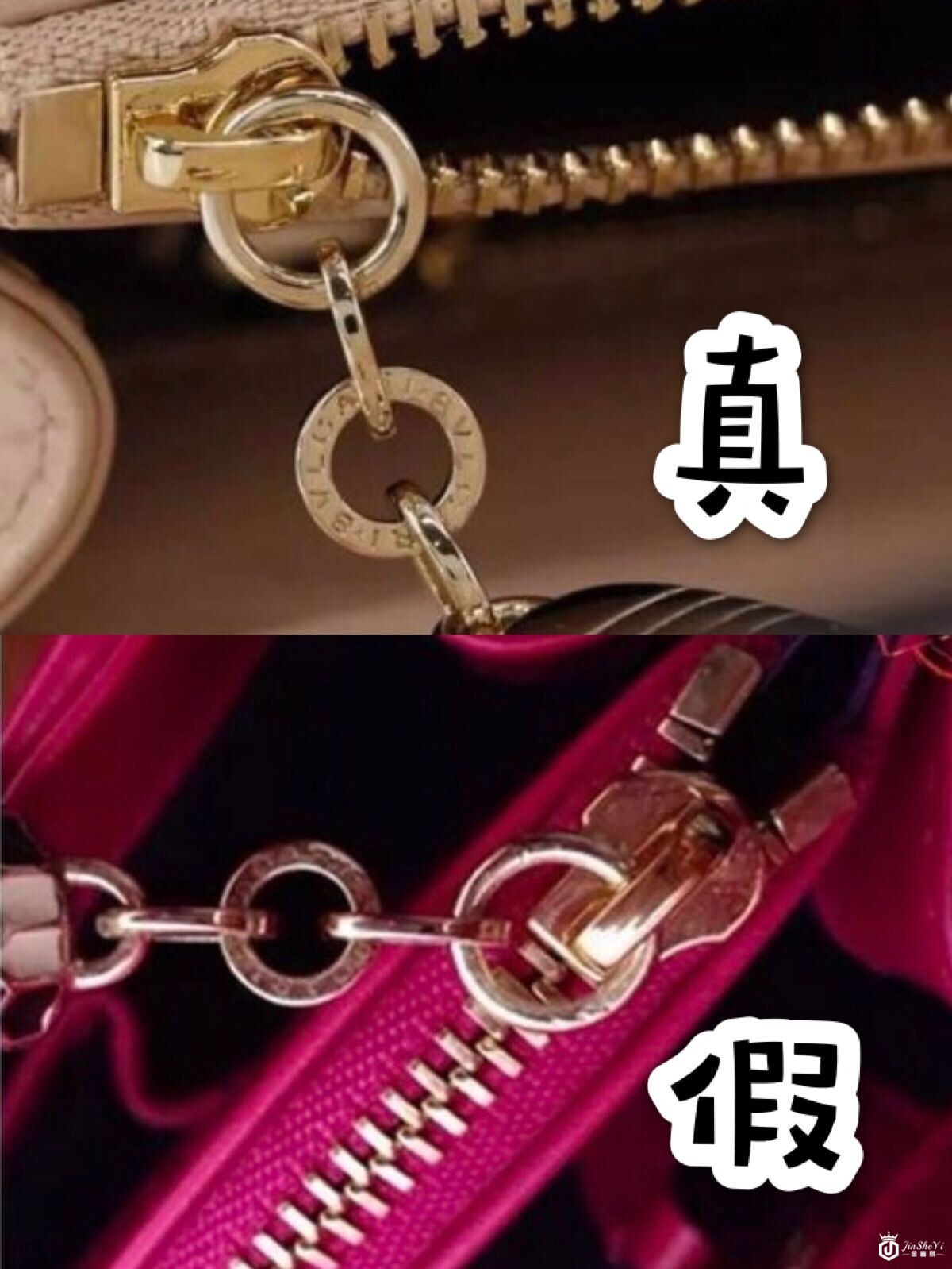 3. 五金件:正品五金扣刻字较深,字体整齐,表面有立体感,反光感适中。包拉锁带有BVLGARI字母的金属圆环。