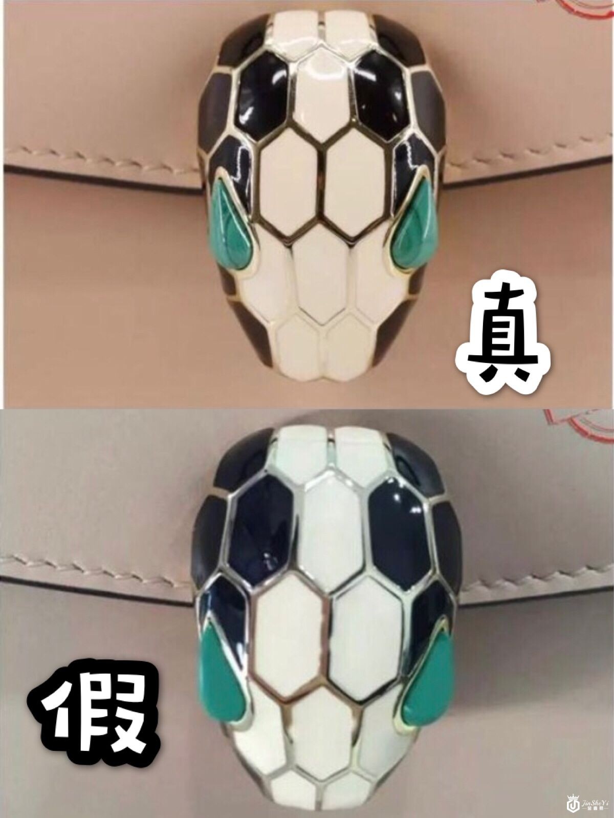 1. 珐琅蛇头:宝格丽包最有标志性的就是它的珐琅蛇头。它是最重要的,第一眼看的也是它了,蛇头的眼睛镶嵌的是孔雀石或天然玛瑙,这一点是最容易辨别的地方,而且由于是天然孔雀石蛇的左右眼纹路不一样是正常的