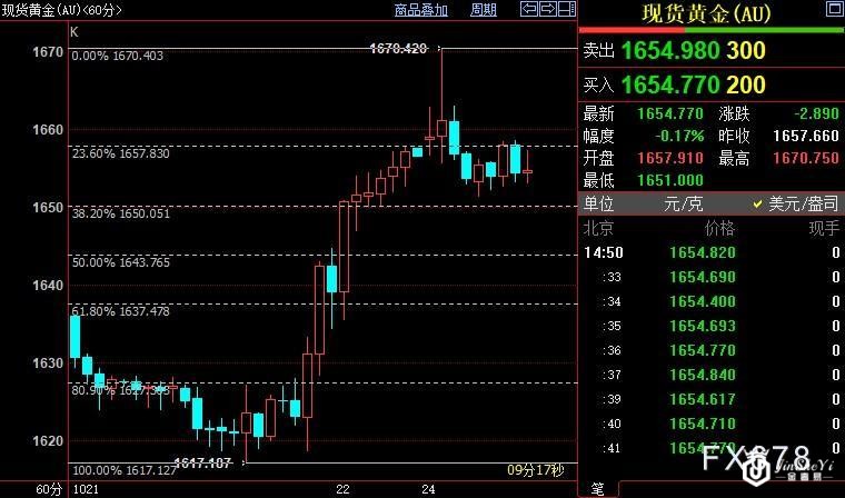 周一(10月24日),国际金价冲高回落,尽管市场微弱预计美联储将在今年晚些时候软化激进政策立场,但金价尚未走出困局,在1870美元附近遇阻,后市料重回1650美元下方。 北京时间14:58,现货黄金下跌0.07%至1654.84美元/盎司;COMEX期金主力合约上浮0.20%至1659.7美元/盎司;美元指数上涨0.23%至112.134。 芝商所的最新数据显示,上周五COMEX黄金期货未平仓合约减少约2700手,结束三连增。相反,成交量重启升势,增长约11.17万份手。金价当前强势上扬,但未平仓合约萎缩,暗示金价在短期内持续反弹的机率似乎不大。 City Index分析师Matt Simpson表示:“我认为黄金尚未走出困境。”他并补充称,美联储是否接近暂停加息将取决于下次会议召开前陆续公布的数据。 尽管人们普遍预计美联储将在11月会议上连续第四次加息75个基点,但官员们正试图缓解市场悲观情绪。旧金山联储主席戴利上周五(10月21日)表示,央行应避免使经济陷入“非强制下滑”,现在是时候开始谈论放慢加息步伐了。 由于美国大幅加息增加了持有非孳息资产黄金的机会成本,黄金价格今年迄今已下跌超过9%。City Index的Simpson表示:“如果通胀继续走高,美联储没有转向,黄金明年可能会跌向1600美元至1500美元区间。” 小时图上看,金价运行在1650美元上方,跌破后将进一步下探1644美元,它们分别是1617美元-1670美元上行区间的38.2%斐波那契回档位和50%斐波那契回档位。