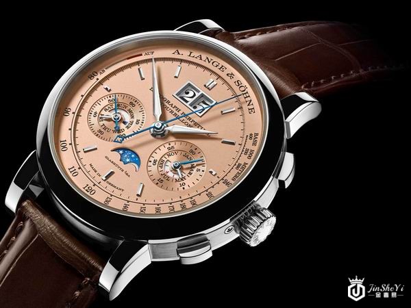 表冠用于上链与设置时间,两个按钮用于操作计时码表,快速校正按钮用于同时推进所有日历显示,隐藏式校正器分别调校星期、月份和月相显示。暖色18K玫瑰金表盘与18K白色K金表壳以及18K黄金镀铑指针和镶嵌刻度的冷酷形象构成悦目对比。在明晰的表盘布局中,大日历显示和两个副表盘形成等边三角形,使腕表成为经典的标志。搭载朗格表厂自制L952.2型手动上链机芯,该机芯由729个零件组装而成,每个细节皆为手工修饰,一丝不苟,其复杂之处足以体现朗格致力突破机械制表界限的决心。