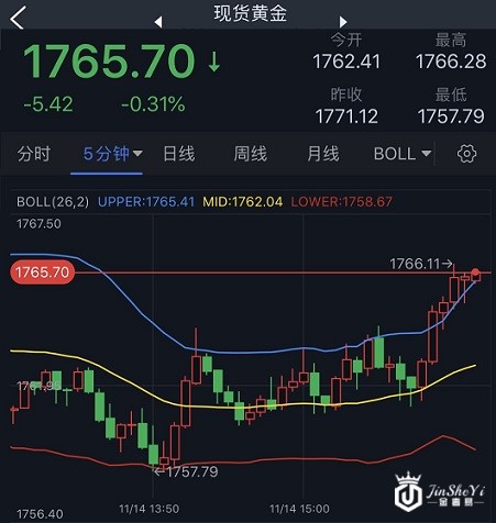 周一(11月14日)欧市盘中,现货黄金短线持续反弹,金价刚刚突破1765美元/盎司,日内跌幅缩窄至5美元左右,亚市尾盘金价一度跌破1760美元/盎司。知名财经资讯网站Economies.com周一最新撰文,对日内黄金走势进行前瞻分析。