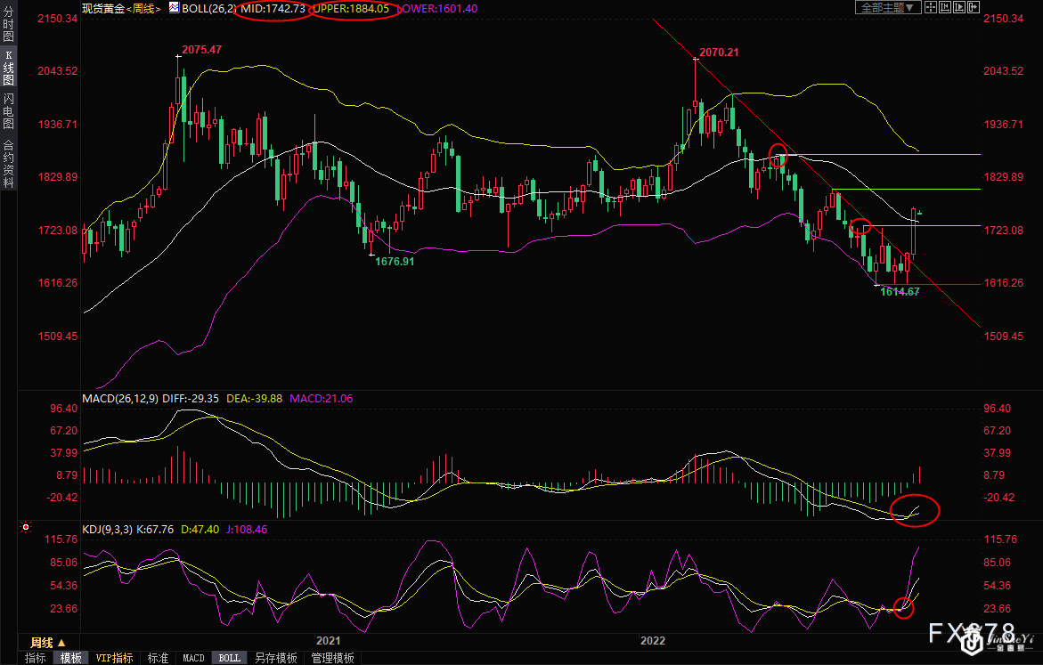 周一(11月14日)亚洲时段,现货黄金低开后震荡走弱,目前交投于1759.02美元/盎司,因此前美联储理事称抗通胀立场没有“软化”,帮助美元和美债收益率反弹,进而令金价承压;虽然中长线已经转向多头,但考虑到上周金价涨幅较大,短线的回调压力有所增加。 “在美联储沃勒反击市场对CPI疲软的反应之后,黄金走低,因为只有一个数据点不表明通胀已经受到抑制,”SPI资产管理公司的管理合伙人Stephen Innes说。“波动将持续下去,毫无疑问,通胀仍是市场的支点。” 本交易日经济数据较少,投资者需要留意G20峰会相关消息,留意市场对本周将出炉的美国数据的预期情绪。目前市场预计周三将出炉的美国10月零售销售环比增长0.9%,前值为0,偏向支撑美元并利空金价。 周线级别:单边下跌后反弹;金价在1615附近筑底成功,不仅顶破了下行趋势线阻力,而且顶破了布林线中轨1742.87附近阻力,MACD和KDJ金叉良好运行,后市走势初步转为多头,有望进一步涨向布林线上轨1884.26附近,6月份高点1878.65附近强阻力也相去不远。短线的话,8月12日当周高点1807.72附近也还存在一定的阻力。 下方留意9月16日当周高点1735.02附近支撑,失守该位置前,后市偏向多头;5周均线支撑在1702.35附近,若回落至该位置下方,则削弱后市看涨信号。