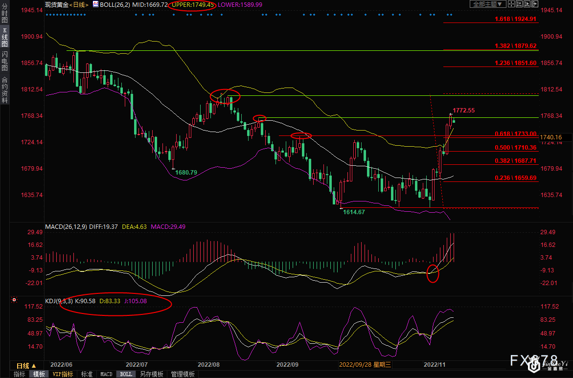 nload='javascript:if(this.width>500)this.width=500' align='center' hspace=10 vspace=10 rel='nofollow'/>日线级别:震荡上涨;金价突破了近两个半月的震荡区间1615-1735;MACD金叉并上穿零轴,布林线开口,金价后市偏向沿布林线上轨向上运行,目前正试探8月25日高点1765.36附近阻力,若能顶破该阻力,则有望进一步涨向200日均线1803.77附近,8月10日高点阻力也在该位置附近。 鉴于短线金价涨幅较大,KDJ发出短线超买信号,金价短线存在一些回调风险,可能会对9月12日高点1735.02位置进行回踩确认,失守该位置附近支撑前,后市偏向多头;布林线上轨1749.38附近也存在一定的支撑;11月9日高点支撑在1722.24附近,100日均线支撑在1714.13附近,或意外回落至该位置下方,则增加短线看空信号。