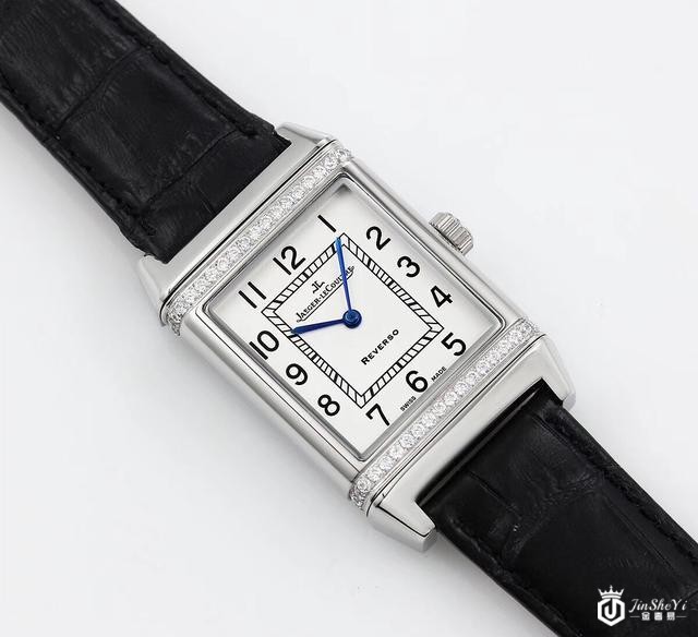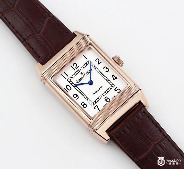 积家皮带机械腕表,翻转系列,18K玫瑰金表壳,长方形表盘,搭配棕色小牛皮表带,白色表盘,两针,阿拉伯数字刻度,可以翻转,并且可以看到机芯,很有特点。