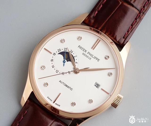 百达翡丽皮带机械腕表,带有月相显示,18K金表壳,颜色很正,搭配棕色小牛皮表带,手表非常的舒适,表底镂空设计,可以看到机芯,搭载进口机械机芯,走时非常的精准。