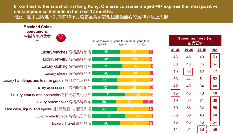 依此调查可知,在中国内地,未来12个月对奢侈品购买表现出最强信心的是46岁以上人群,他们对大多数的奢侈品品类都有较浓厚的购买信心,而相形之下,“千禧一代”人群除了对“高档品牌鞋类”与“高档美容及化妆品类”产品购买兴趣相对较高外,对其他品类的购买信心都不及46岁以上的所谓“父辈”的财富富集人群。