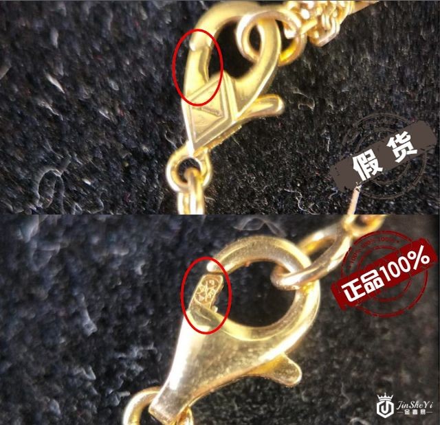 注意观察观察项链接口处的弹簧扣,真品的梵克雅宝项链在卡口的活动卡口位置有一个细小的梵克雅宝的标志钢印,一般人很难发现。而假货似乎也忽略了这一点,或者锻造工艺还赶不上,假货这里是完全空白的。