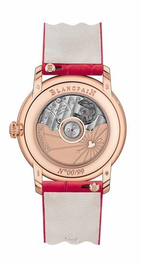 宝珀“2019年情人节”限量版腕表的“内心”搭载913QL.P机芯,配备直径33毫米的红金表壳;表圈及表耳上镶嵌64颗明亮的切割钻石。这一设计旨在满足女性对高级钟表的至高期望。腕表的自动上链机芯配备硅质游丝,动力储存达40小时;开阔的夹板令月亮美人腕表的美丽背透尽入眼帘,红金摆陀的尺寸更为明朗,上面镌刻着醉人心魄的爱的象征。