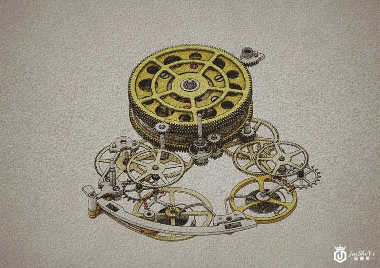 ▲发条盒内部设置了一组差速器,这么一来即使有一条轮系煞住了也不会让整个系统锁死。