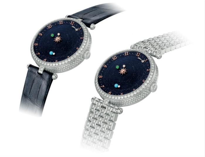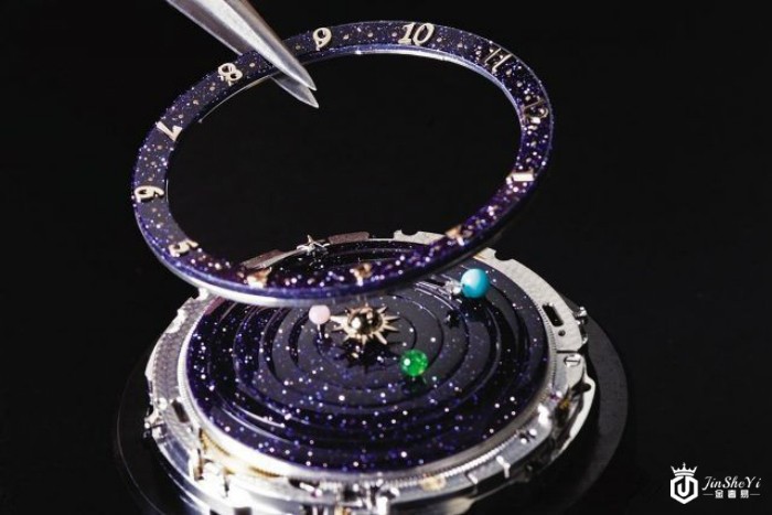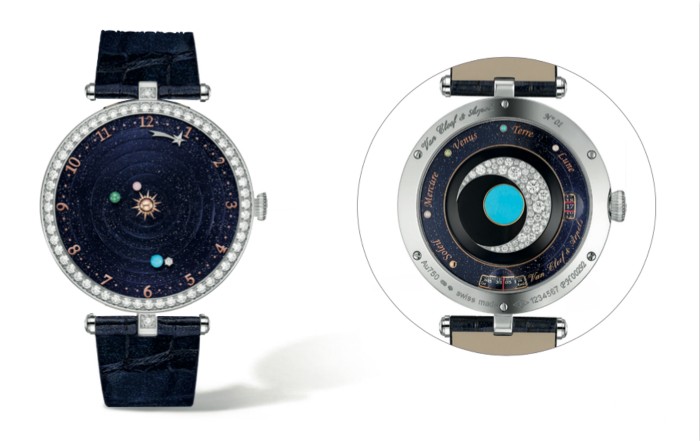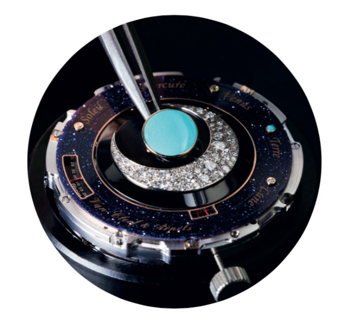 2014年SIHH日内瓦国际高级钟表展上,梵克雅宝将浩瀚宇宙萃炼成表盘上的玲珑天地,推出了Midnight Planétarium腕表。这是梵克雅宝从传统的天象仪撷取的灵感,流行于18世纪的天象仪勾勒出太阳系的立体面貌,生动描绘行星绕日运行的规律,而这一幕被梵克雅宝的钟表师、珠宝匠和各领域的工匠们,以精湛的制作技艺,生动地还原于表盘之上。