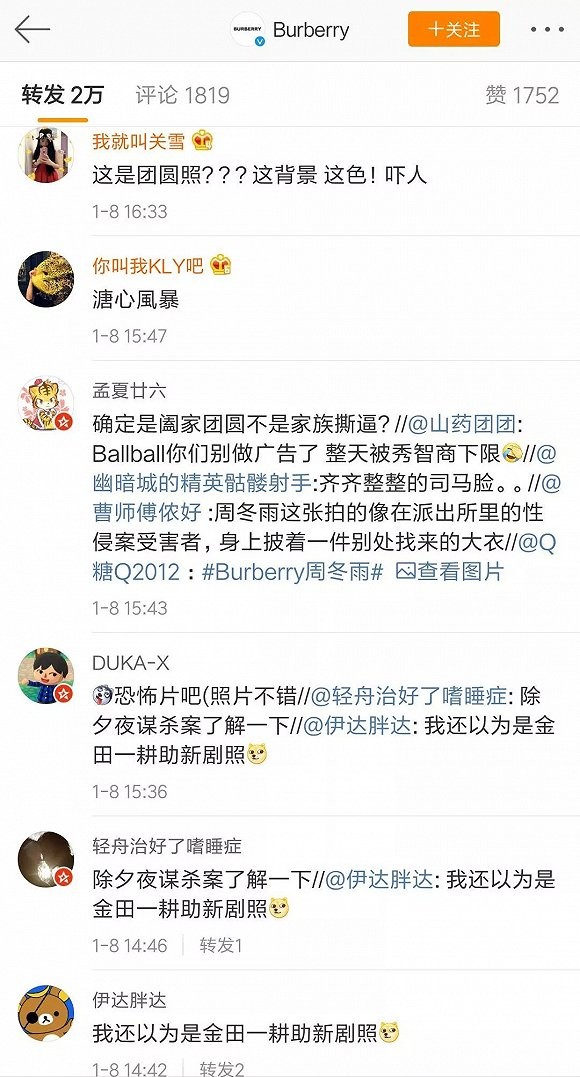 果然,这组大片在网络上的引发了负面反响,网友纷纷表示Burberry根本不了解中国的新年文化,还根据照片脑补出了“豪门恩怨”、“老宅谜案”等各种剧情,反正就是与新年没有任何关系。目前,Burberry发布的4条新年大片微博,转发总数已达8万,评论总数近6000条,除了赵薇和周冬雨的粉丝在“刷好评”,其他很多网友都对照片所传达的“阖家团圆”主题表现出了质疑态度。