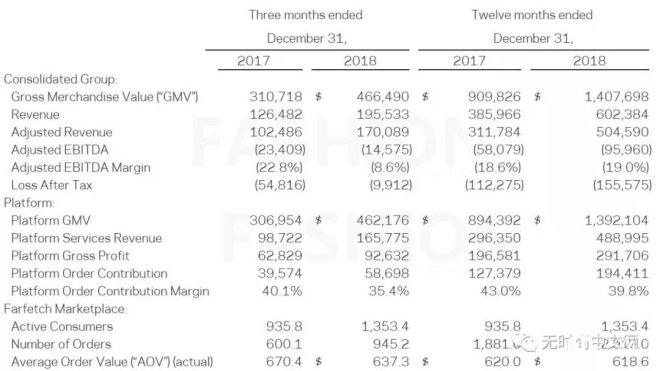 2018年,Farfetch 录得6.024亿美元收入,较2017年3.860亿美元有60.1%的增幅,adj EBITDA 亏损加剧56.2%至9,596.0万美元,2017年亏损5,807.9万美元。
