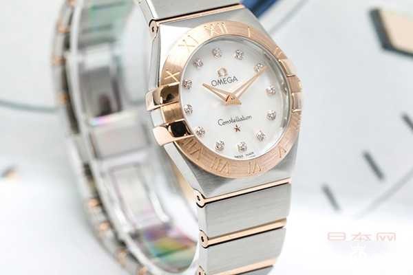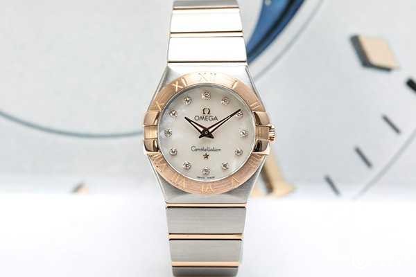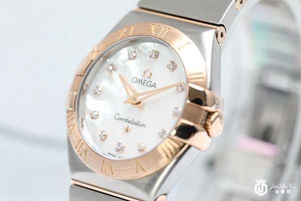 欧米茄星座系列123.20.27.60.55.001腕表搭载的是Cal.1376石英机芯,走时精准度无可挑剔,防水深度为100米。外观上来看,星座系列一如既往的“托爪设计”十分明显,精钢表壳直径27mm,并且附带着镶刻罗马数字的18k红金表圈。覆盖着圆弧形的抗磨损蓝宝石水晶玻璃的表镜,银白色的表盘为珍珠贝母材质,代替时标的是12颗璀璨的钻石,和贝母一起让整个表盘更加闪耀。红金材质的双指针简洁大方,间金表带不仅美观而且防刮耐磨,佩戴舒适。这款欧米茄电子手表官方售价为36800元,而回收价格方面,95新的是25000元左右,大约是售价的6.7折。