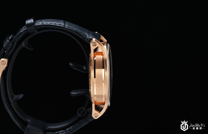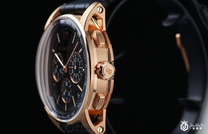 位于腕表一侧的表冠同样采用18K玫瑰金材质,其上镌刻了品牌LOGO“AP”字样,并且以防滑纹理打造,调校时间时不易滑手。