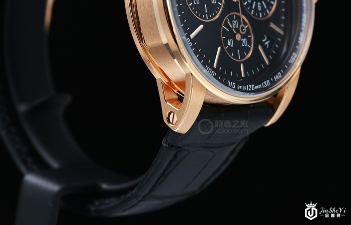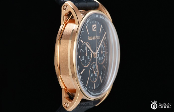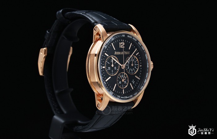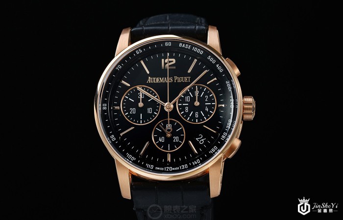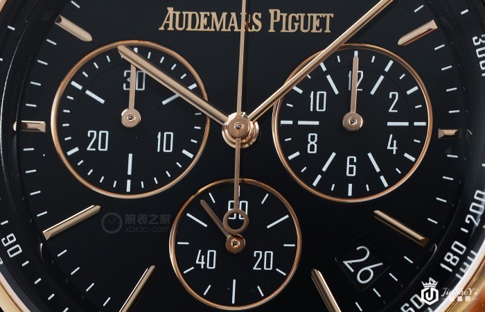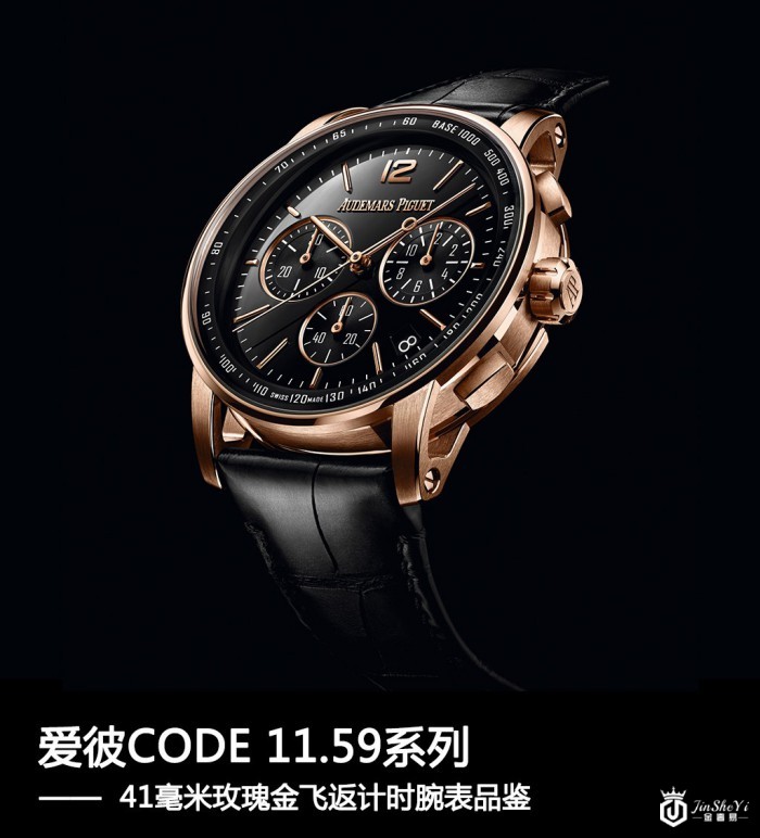 这枚爱彼CODE 11.59系列41毫米玫瑰金飞返计时腕表表盘采用黑色亮漆图层设计,副盘、指针以及时标采用18k玫瑰金材质;表盘上醒目的品牌logo则采用的是24k玫瑰金材质立体设计。位于3点位的小时计时盘、6点位的小秒盘以及9点位的30分钟计时盘均匀分布在表盘之上,另外,为了方便用户的日常读取日期的使用,4点位至5点位之间还设有一个日期显示窗口。