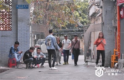 3月16日,白云皮具城旁的桂花岗小区,数名拉客仔和看场子人员在小区门口望风。