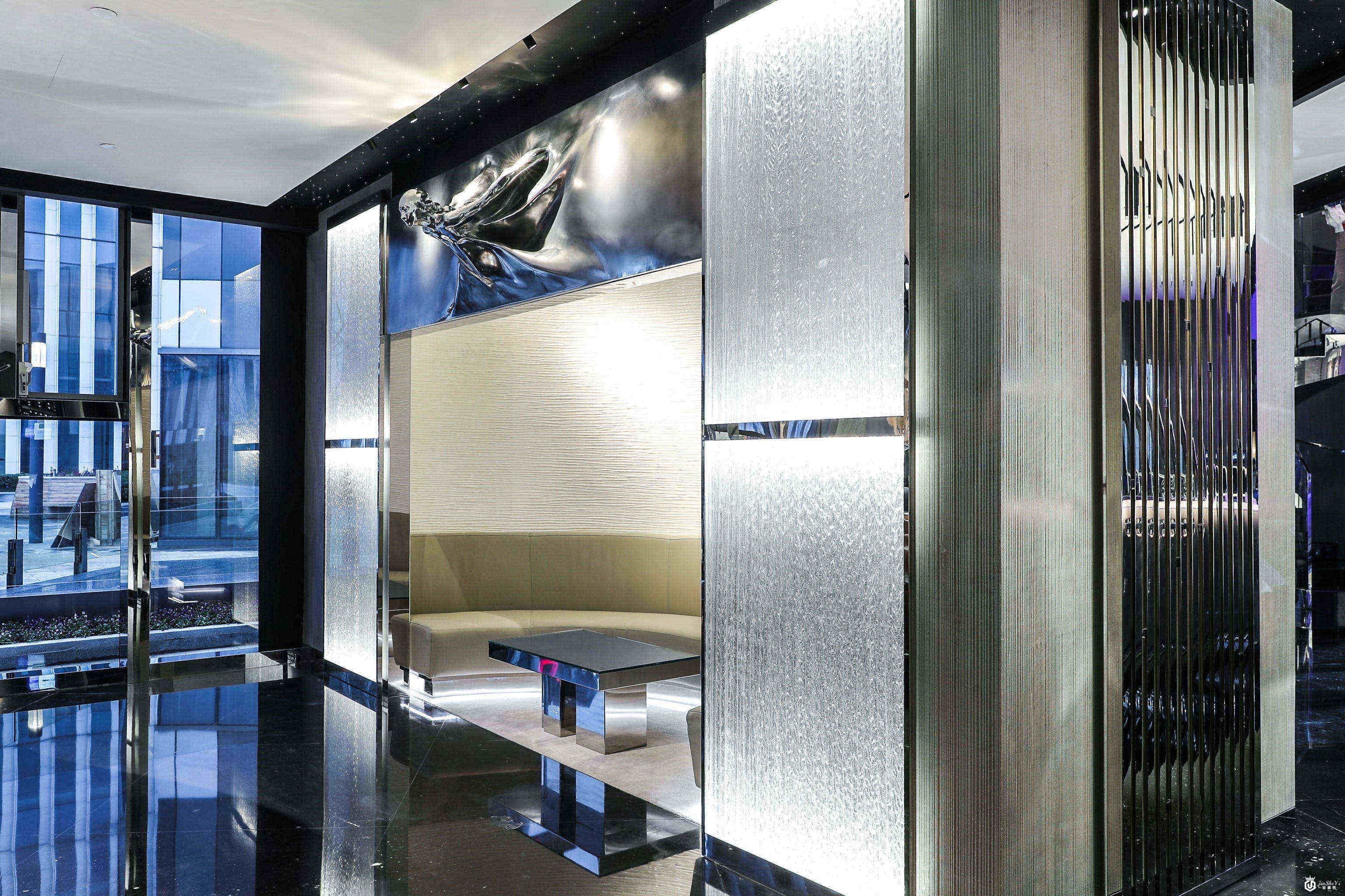 而休息区(The Customer Lounge)的环形沙发采用了劳斯莱斯汽车座椅所用的皮质,沙发上方探出身子的欢庆女神让人联想到历史悠久的欧洲建筑,两边的银丝隔屏增添了整个空间的奢华感,科技化触摸屏的桌子更让整个休息过程更加奢华舒适。