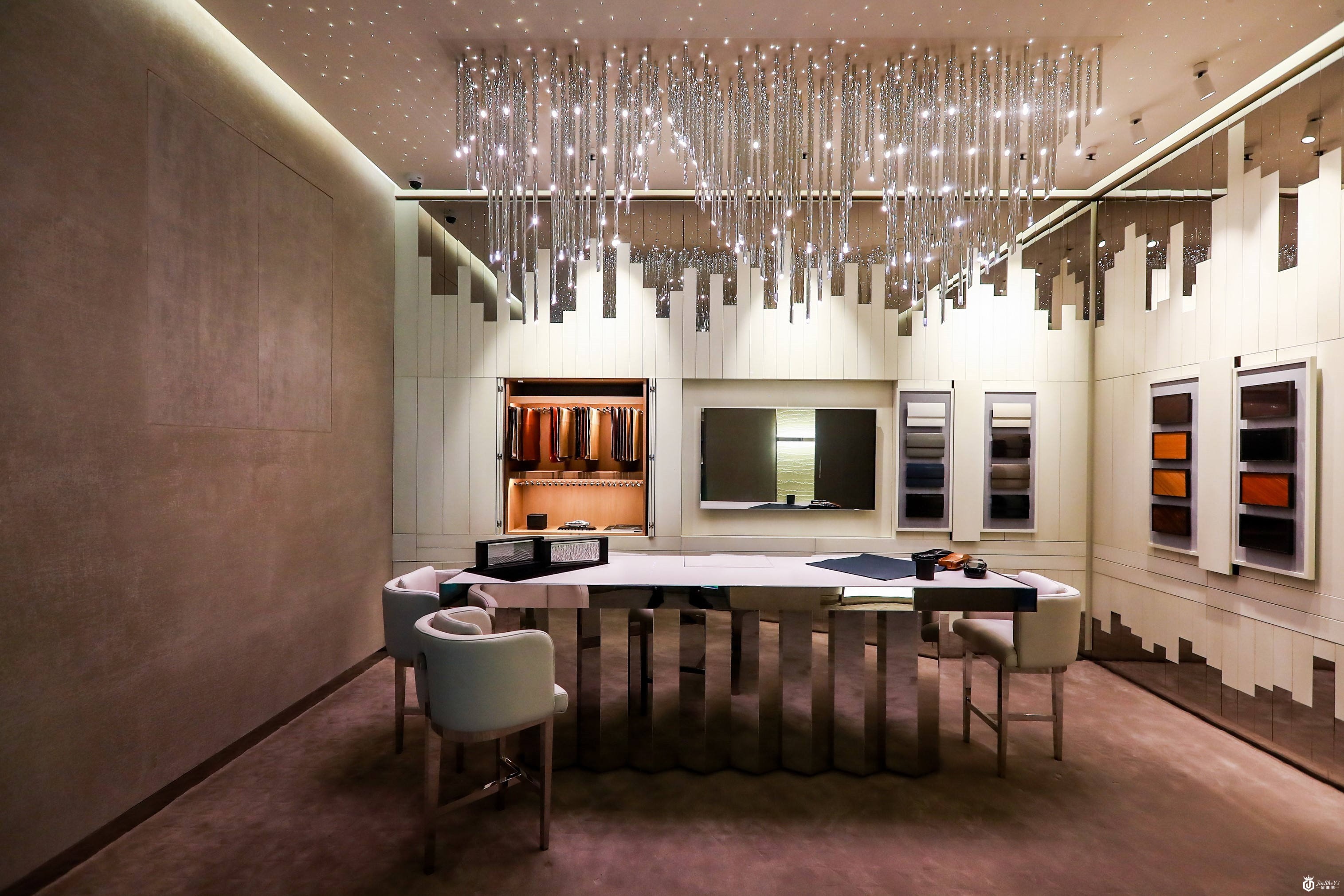 精品店中的定制工坊(The Bespoke Room)是体验品牌精髓的地方。Bespoke高级定制服务触摸屏可让顾客可自行挑选颜色、花纹、材质等细节,进行车辆的个性化定制选择。推开墙面便是装着车辆定制所需材质的隐形暗格,顾客在触摸屏上初选了材质之后,便可亲自触摸和体验。