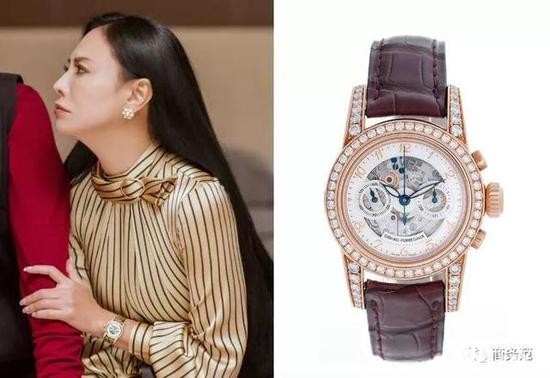 手表方面,蒙太戴的是一枚GP芝柏的女款镂空腕表,玫瑰金外圈镶钻,稀有皮质表带,不仅品牌选的是顶级腕表中偏小众的,款式也不多见~