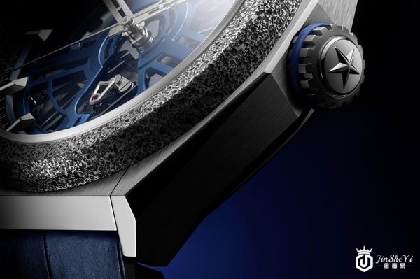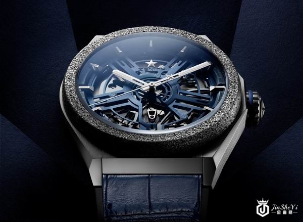 DEFY创想家腕表层次分明且富有未来感,在前卫摩登的外观下,完美展现了机械律动的独特魅力。通透轻盈的镂空表盘下,跳跃的是真力时自主研发的新型机械腕表心脏——“真力时振盘”。薄如蝉翼的单晶硅振荡器,在时间的分秒流逝中不断搏动。宽长的时针和分针扫过机械结构,而细长的中置小秒针顶端则采用星形装饰,配备秒针停走系统,可实现超精确校准,精确到秒。