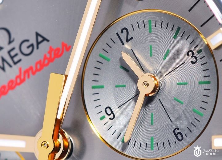 旋入式黄金表冠上凸雕欧米茄品牌标识,精致小巧的表冠侧面设有防滑纹理,便于佩戴者操作。表冠上下分别设有计时开始及暂停按钮和计时归零按钮。