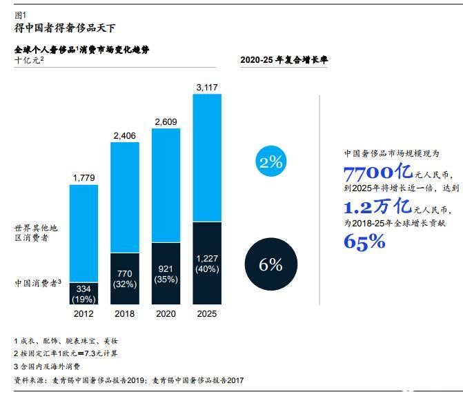 报告指出,到2025年,奢侈品消费总额有望增至1.2万亿元人民币。2012年至2018年间,全球奢侈品市场超过一半的增幅来自于中国。展望未来,预计至2025年这个比例将达到65%。