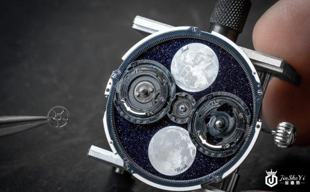 Arceau L’heure de la lune的表面却十分简洁,将每59天旋转一周的复杂模块隐藏得天衣无缝。两枚月球以白色珍珠母贝打造,6点钟方向参照真实月球纹路并写着「North」的代表北半球月相,12点钟方向写着「Sud」的南半球月相则暗藏了插画家Dimitri Rybaltchenko所设计的飞马图腾,颇有意思。无论是采用犹如星空的砂金石或陨石面盘,这件作品都非常传神地表现来自月亮的讯息,深刻,美丽。