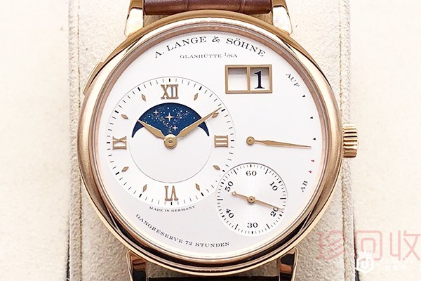而且朗格手表虽然不是瑞士产的,但由于它在德国制表当中也是数一数二,保值力度也不输给很多瑞士品牌,大家可以来看到一个朗格LANGE 1系列139.032腕表的例子,这款表公价是366000元,整体的偏心设计具有一种既时尚又古典的美感,41毫米的表壳材质为18k玫瑰金,在银白色的盘面上,右下方为带停秒的小秒盘,左侧为时分加月相显示盘,右上方为双格日期与动力储备显示,搭配红棕色的鳄鱼皮表带,内载朗格自产的L095.3机芯,上满链的动力储备在72小时左右。95新无附件的朗格LANGE 1系列139.032腕表回收价是在199000元左右,那么约等于是5.4折,一般瑞士产的手表品牌回收价差不多是原价的3折到7折,朗格手表这个表现也是比较可观的。