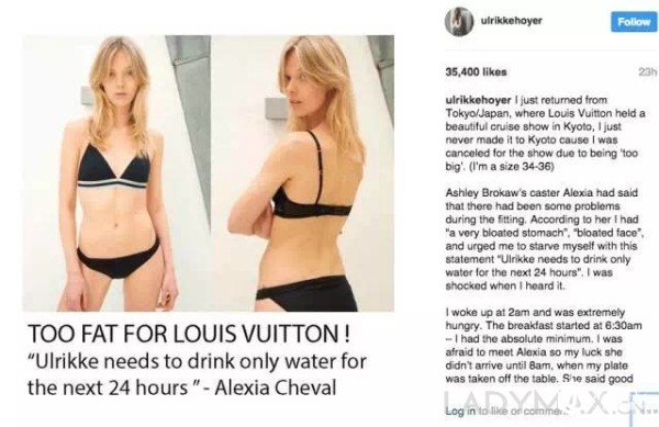 深有意味的是,在这起事件发生的短短3个月后,LVMH旗下的核心品牌Louis Vuitton就因类似问题遭到抨击。20岁的丹麦模特Ulrikke H?yer在社交媒体Facebook和Instagram上发表长文《LV觉得我太胖》,引起众多网友同情和支持,Ulrikke H?yer在文中透露,本次大秀的选角导演Ashley Brokaw因觉得她略浮肿,要求她在秀前24个小时只能喝水,最终她按要求做了,但Ashley Brokaw仍旧在秀前将她踢出了走秀名单。
