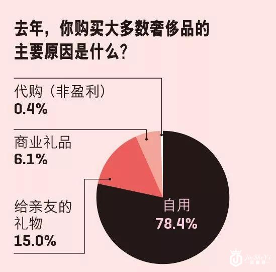 自用依旧是中国奢侈品消费的主要原因。今年“自用”这一原因占到所有奢侈品消费原因的78.4%,这一数字比去年高出3.19个百分点,这也再次说明中产阶级对于生活品质的不断提升需求,拉动了奢侈品消费。另外有15%的人选择“给亲友礼物”成为消费原因,商业礼品的消费原因仅占6.1%。