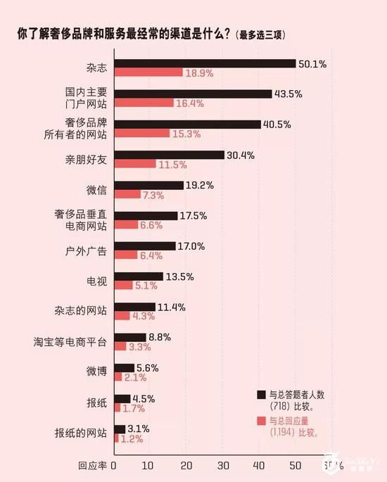杂志依旧是中产阶级获取奢侈品知识的最主要渠道,占所有渠道的50.1%。此外,有43.5%的人从主要门户网站了解奢侈品品牌,有40.5%的用户是从奢侈品品牌所有者的网站渠道了解品牌。