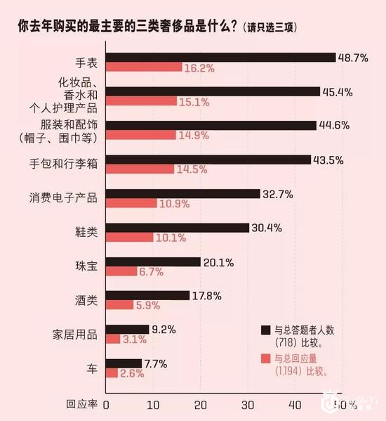 在今年的调研中我们发现,消费者对于奢侈品类别的选择与去年相比几乎没有变化。其中,手表(16.2%)、化妆品和个人护理产品(15.1%)、服装和配饰(14.9%)依然分别位居前三位。手包和行李箱品类(14.5%)、消费电子类(10.9%)、珠宝(6.7%)排名其后。