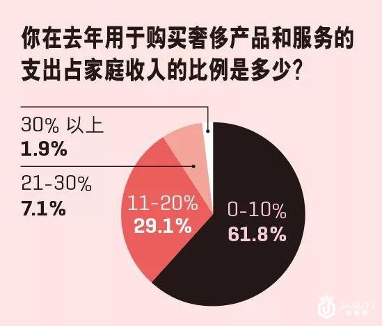 这也就不难解释,为何在今年的调查问卷中,有61.8%的人选择去年用于购买奢侈产品和服务的支出占家庭收入的比例在0~10%,以此计算,北上广深一线城市家庭每年约有3万元的奢侈品消费需求。另外,有29.1%的人选家庭年收入的11%~20%用于奢侈品消费,仅有1.9%的人选择将家庭年收入的30%以上用于奢侈品消费。
